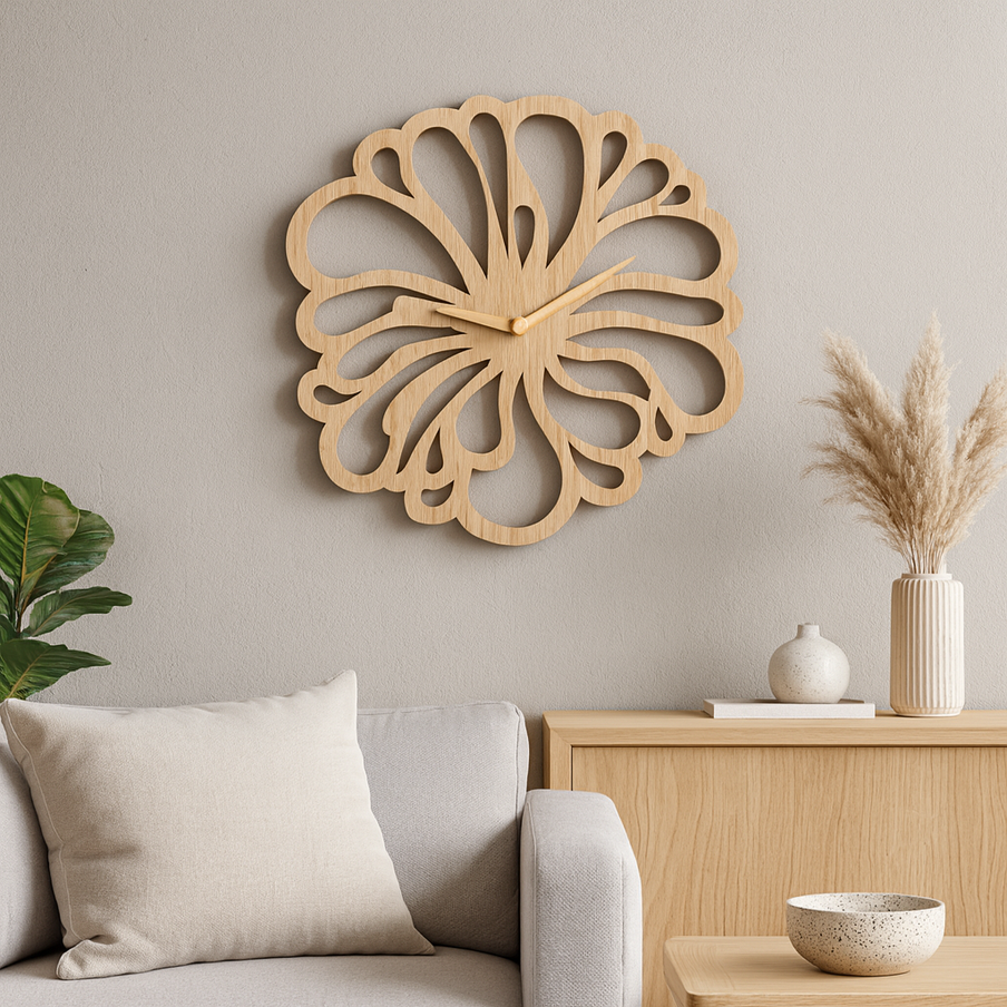 Powered by a silent quartz mechanism, this clock keeps time without ticking—ideal for peaceful environments. Its slim, lightweight build ensures easy mounting, while the flower‑like geometry adds warmth and sophistication.