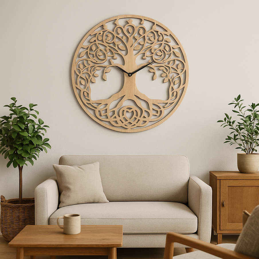The layout evokes growth, balance, and interconnectedness—perfect for spiritual interiors, cozy reading spaces, or rooms that celebrate nature and philosophy. It’s a poetic fusion of timekeeping and ornamental geometry.
