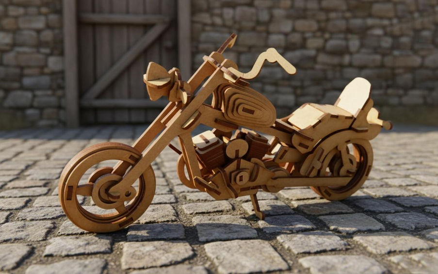 Embrace the spirit of the open road with this exceptionally detailed 3D wooden model of a classic custom chopper.