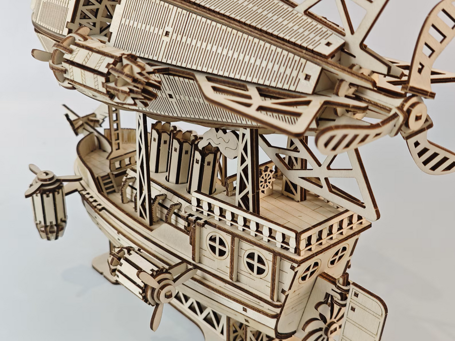 This kit captures the grand scale and mechanical wonder of steampunk aviation, featuring a massive, cigar-shaped dirigible fitted with complex gondolas, gears, and propeller systems. Precision-engineered from high-quality plywood, the model is presented in its beautiful natural wood color, entirely unpainted and untreated. The dark, high-contrast edges from the laser-cutting process perfectly simulate riveted metal plates and industrial machinery, giving it an authentic "clockwork" aesthetic right out of the box.