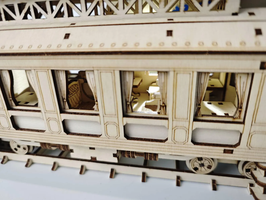 This comprehensive kit captures the elegance of 19th-century rail travel, offering a variety of rolling stock to complete your locomotive collection. Precision-cut from high-quality plywood, the set is presented in its beautiful natural wood colour, entirely unpainted and untreated. The raw finish highlights the intricate laser-etched textures and dark, scorched edges, providing an authentic "golden age of steam" look that requires no additional decoration.