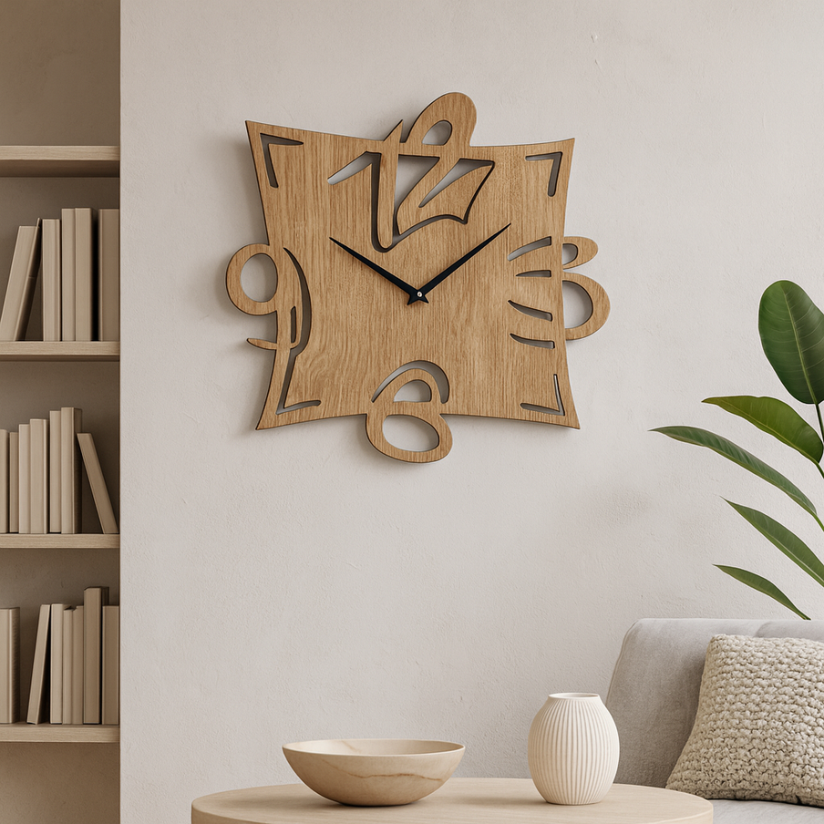 Powered by a silent quartz mechanism, this clock keeps time without ticking—ideal for peaceful environments. Its slim, lightweight build ensures easy mounting, while the abstract layout adds rhythm and personality.