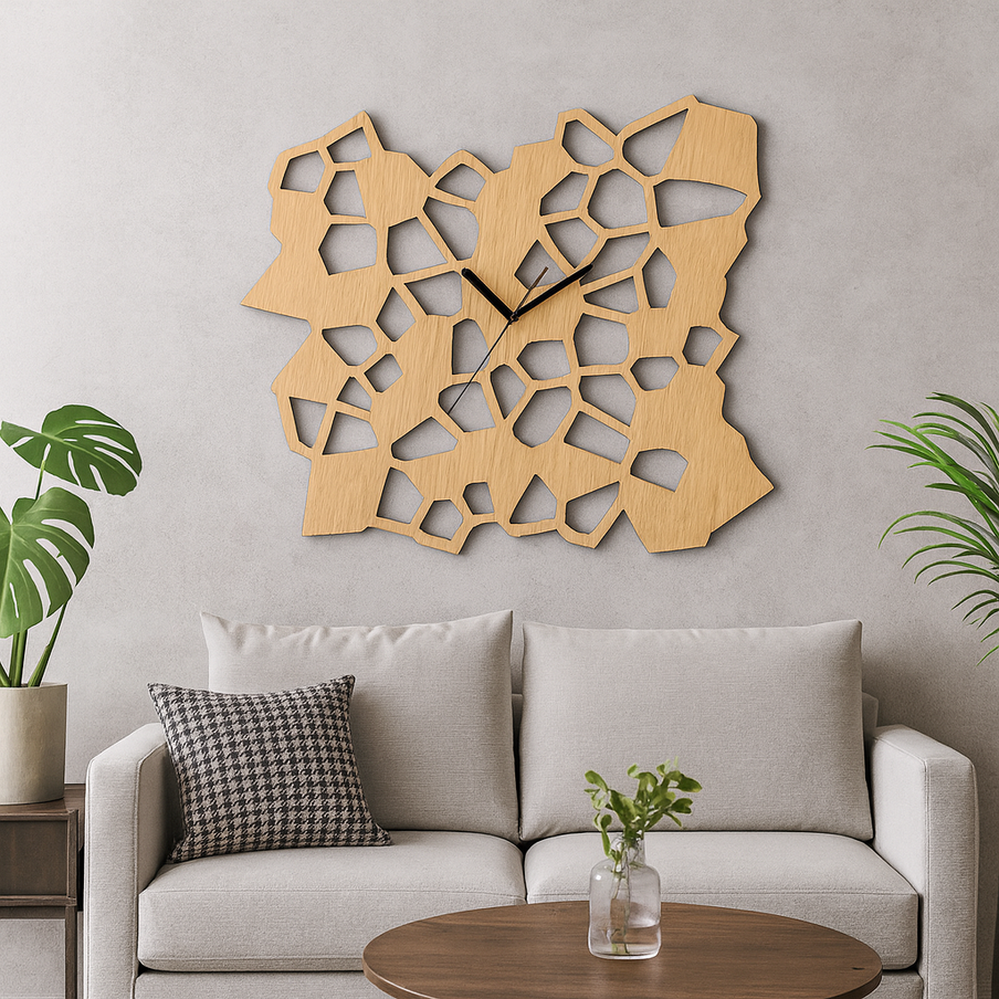 Divide time with precision using the Voronoi Core Wall Clock. Handmade in the UK from premium materials—natural wood, coloured acrylic, or mirrored finishes—this clock features a tessellated Voronoi pattern that radiates from a central point, forming a network of irregular cells that reflect proximity and spatial logic.